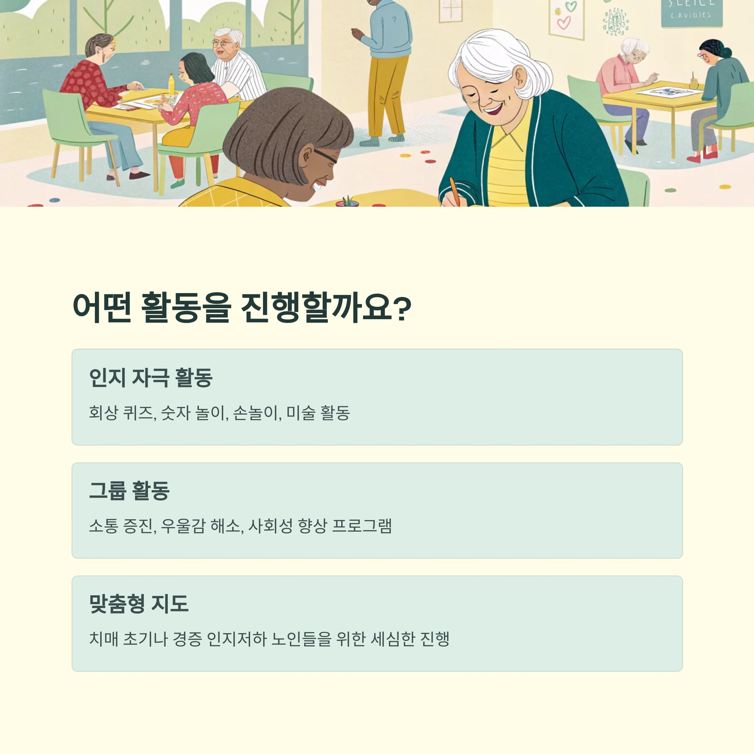 시니어인지활동지도사는 기억력, 판단력, 집중력 등 인지 능력을 자극하는 다양한 활동을 기획하고 진행해요. 예를 들어, 회상 퀴즈, 숫자 놀이, 손놀이, 간단한 미술 활동 등을 통해 노인들의 두뇌를 자연스럽게 자극하는 거죠.