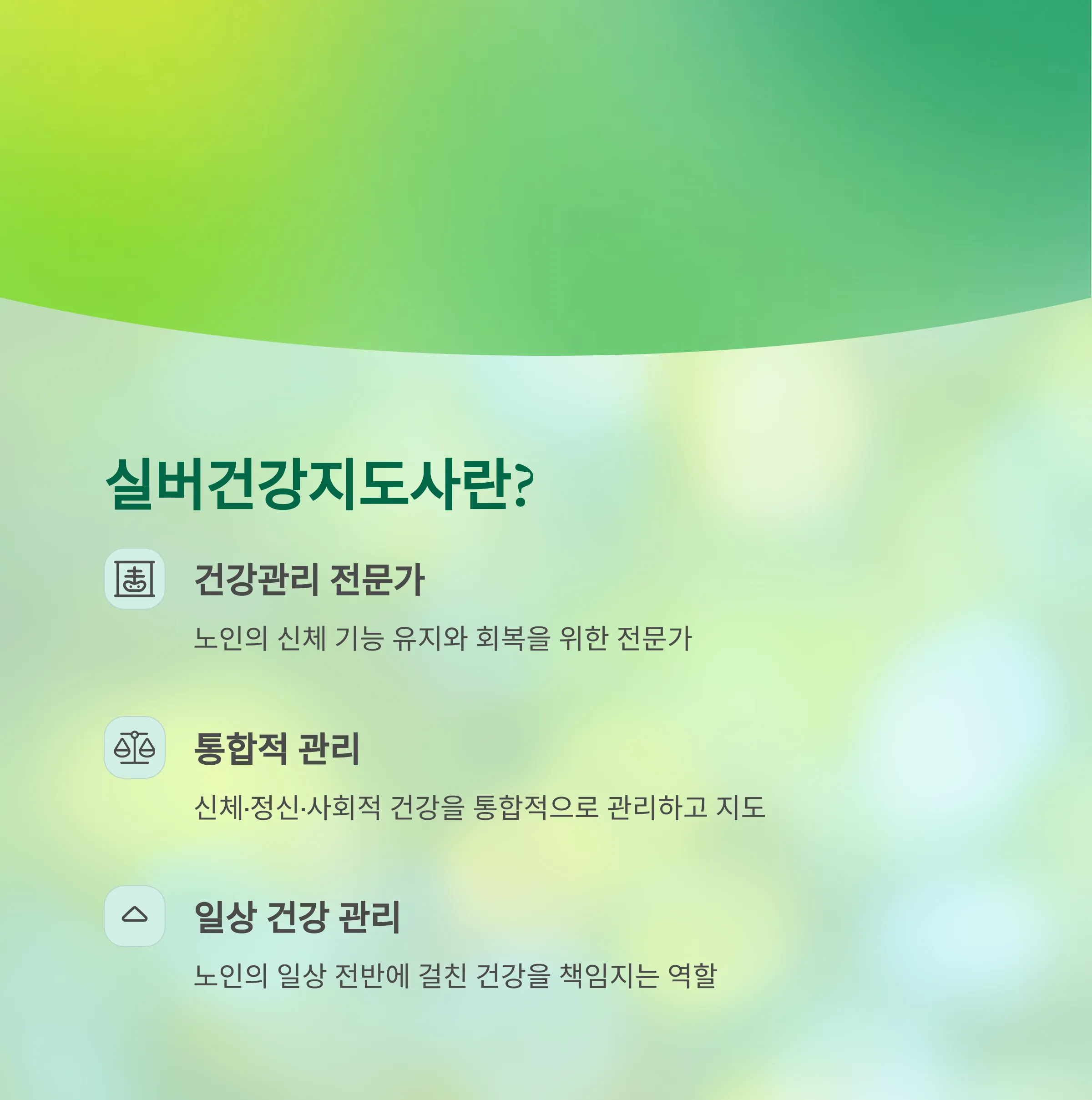 실버건강지도사는 고령사회에서 점점 더 중요해지고 있는 노인의 건강과 삶의 질을 향상시키기 위한 전문 인력입니다. 단순히 운동만 가르치는 게 아니라, 신체·정신·사회적 건강을 통합적으로 관리하고 지도하는 역할을 합니다
