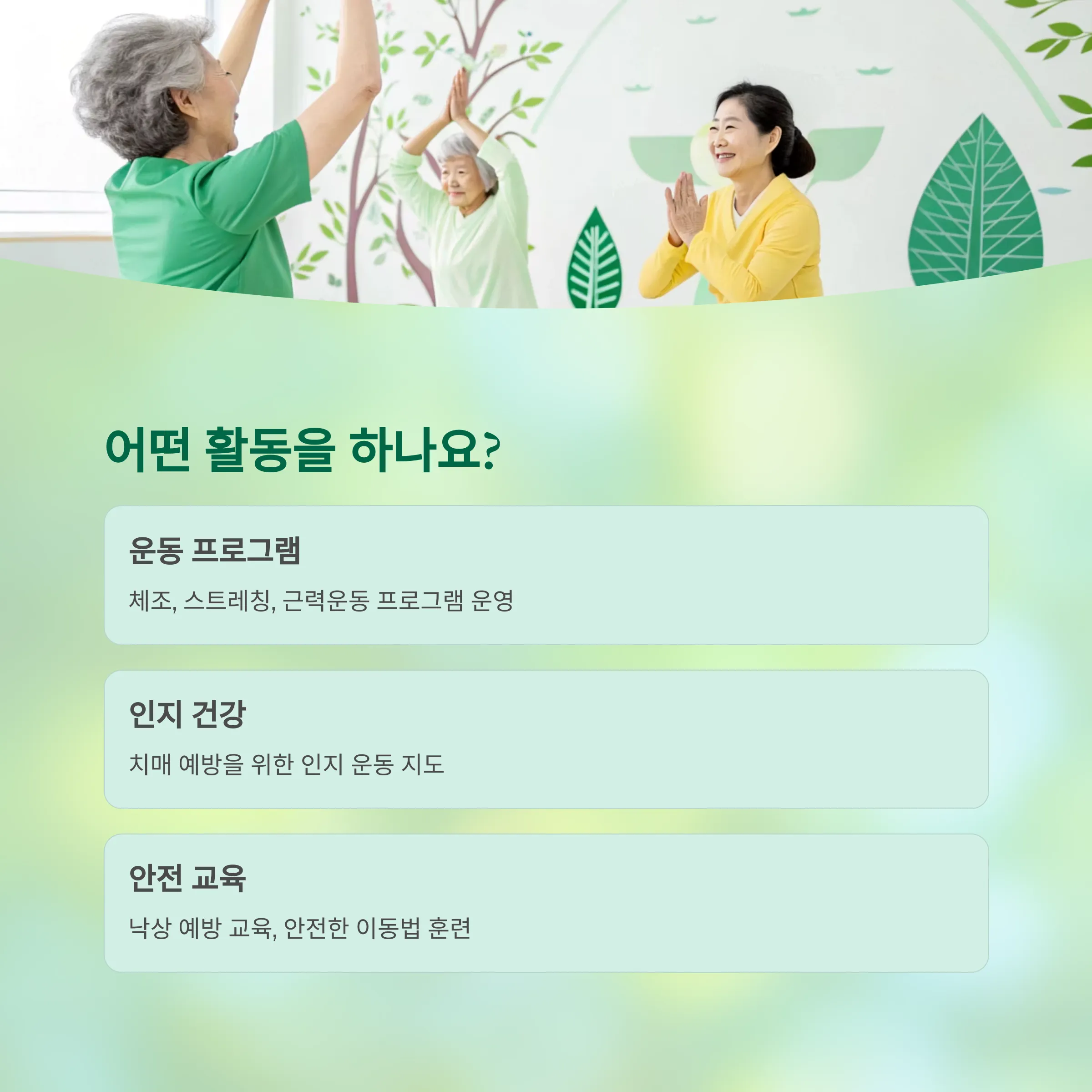 고령 인구의 급증과 함께 노인 건강 전문 인력 수요가 급격히 증가하고 있습니다. 요양시설뿐 아니라, 문화센터, 보건소, 치매안심센터 등으로 활동 무대가 넓어지고 있죠. 지역사회에서 건강강사, 생활체육지도자, 복지관 프로그램 강사 등으로도 활약할 수 있습니다.