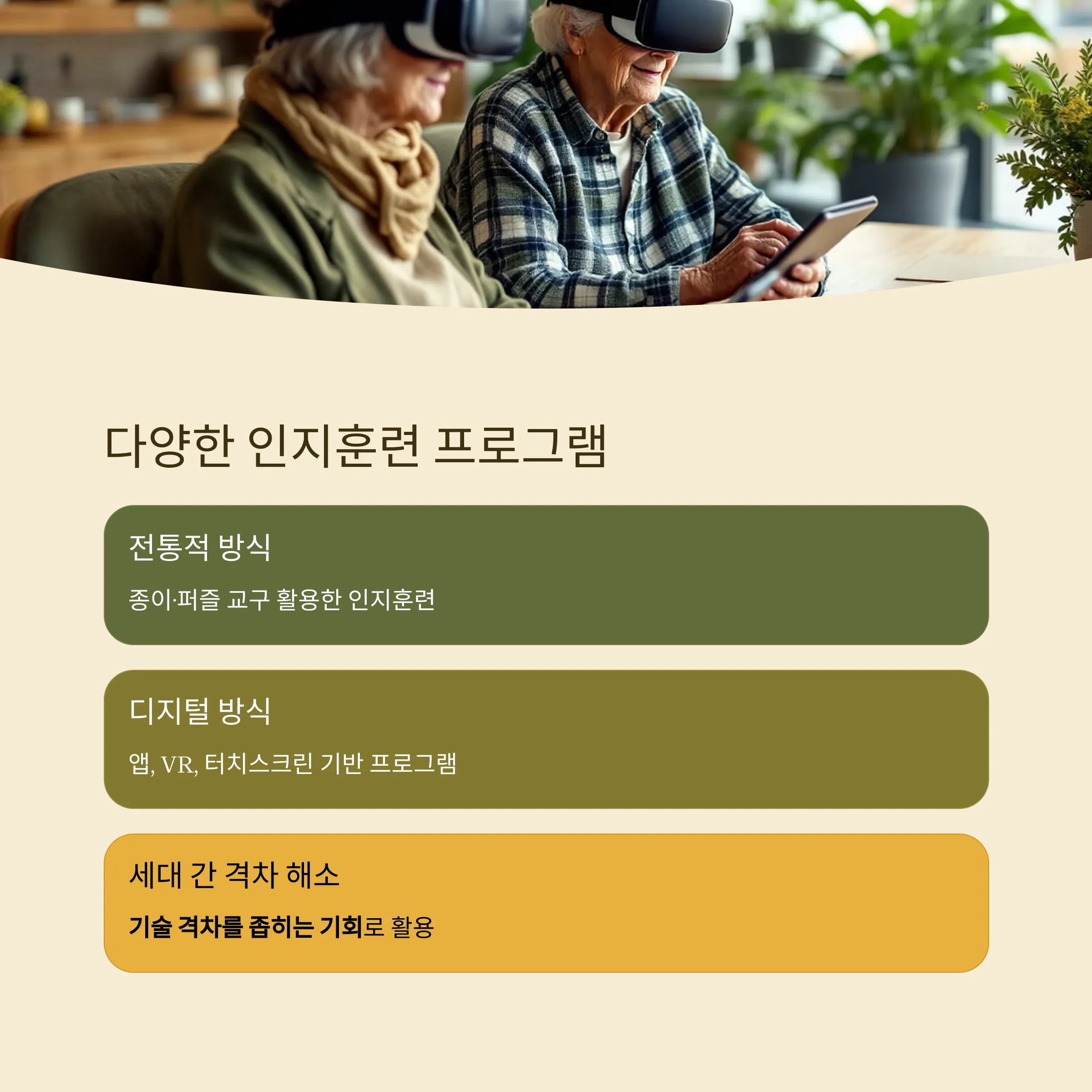 종이·퍼즐 교구부터 디지털 인지훈련 앱까지, 다양한 도구를 활용합니다. 최근에는 VR이나 터치스크린 기반의 프로그램도 활발히 도입되고 있어 세대 간 기술 격차도 좁힐 수 있는 기회로 이어집니다.