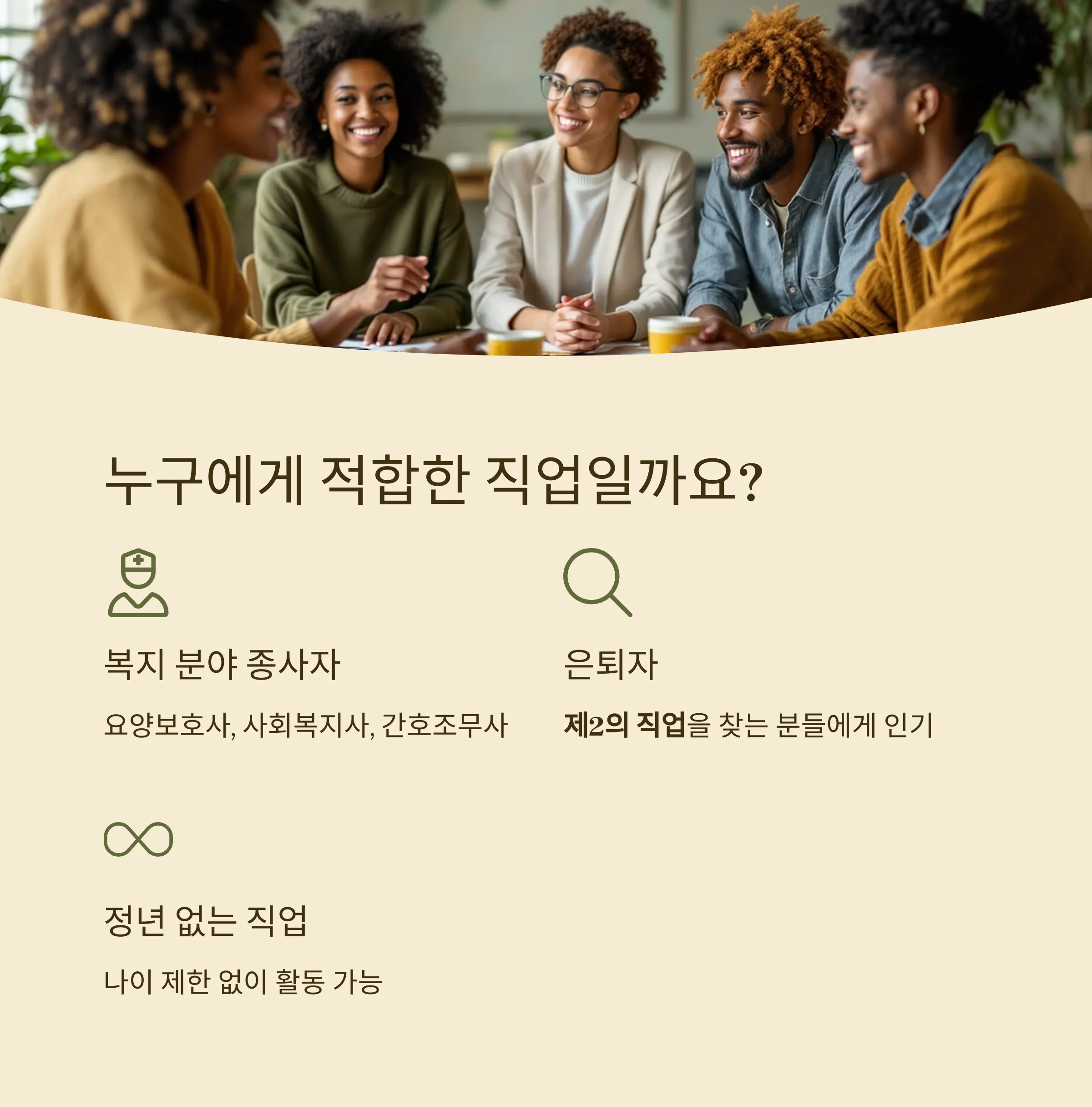 요양보호사, 사회복지사, 간호조무사 등 기존 복지 분야 종사자는 물론, 은퇴 후 제2의 직업을 찾는 분들에게도 인기입니다. 정년이 없는 직업이라는 점도 큰 매력입니다.