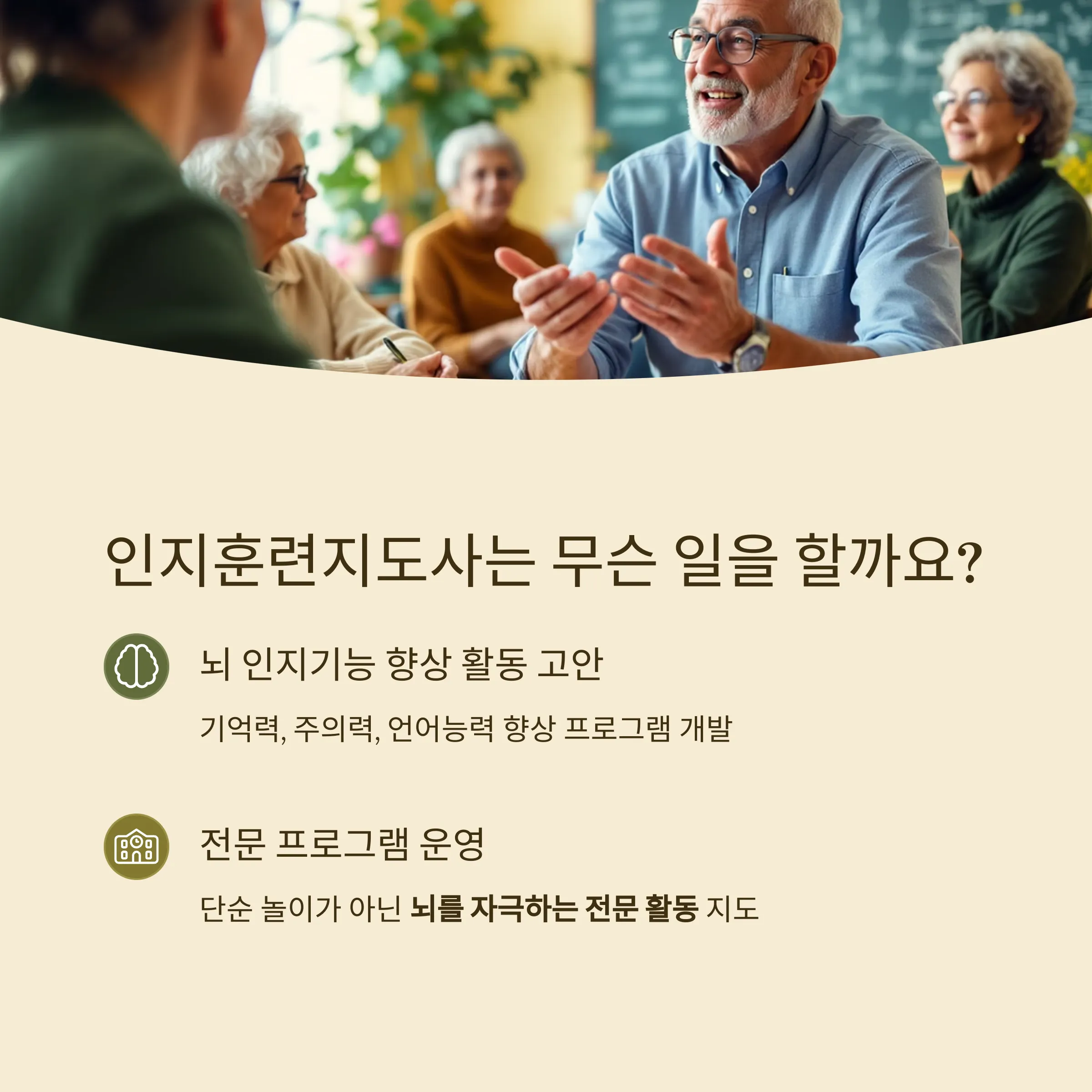 기억력, 주의력, 언어능력 등 뇌 인지기능을 향상시키는 활동을 고안하고, 어르신들이 쉽게 따라할 수 있게 지도합니다. 단순한 놀이가 아니라 뇌를 자극하는 전문 프로그램을 운영하는 역할이죠.