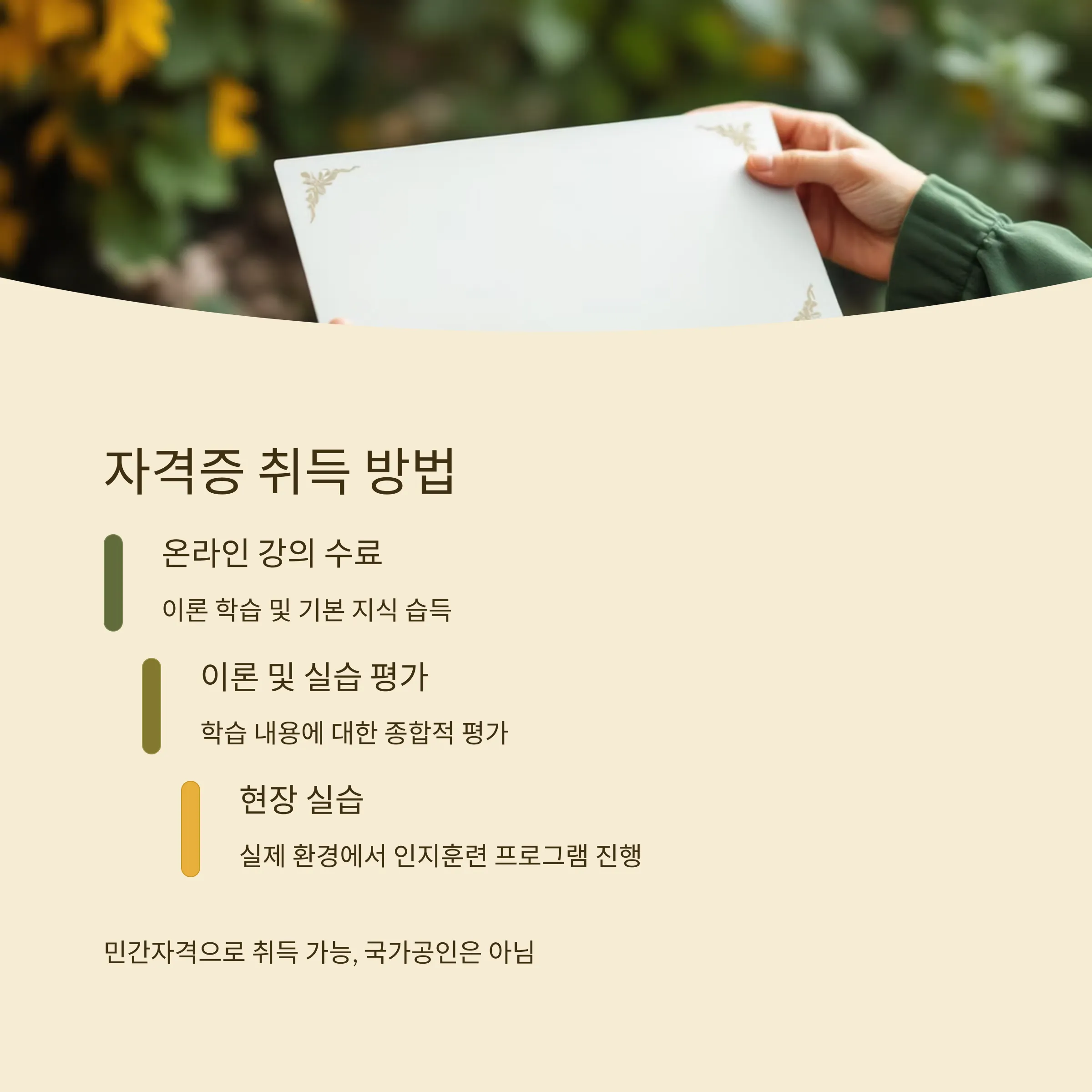 국가공인 자격은 아니지만 민간자격으로 취득이 가능합니다. 보통 온라인 강의 수료 + 이론 및 실습 평가를 통해 인증받게 되며, 일정 교육시간 이수 후 현장 실습이 포함되기도 합니다.