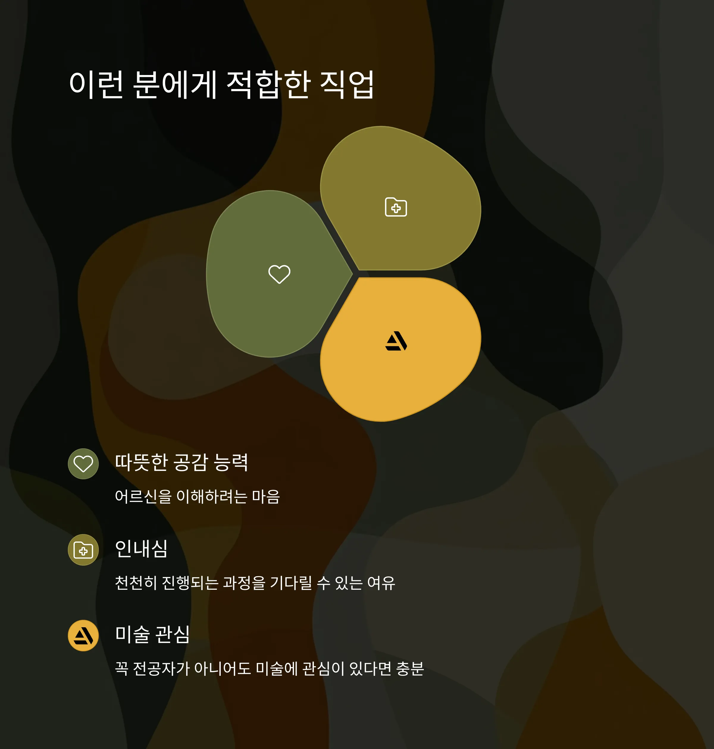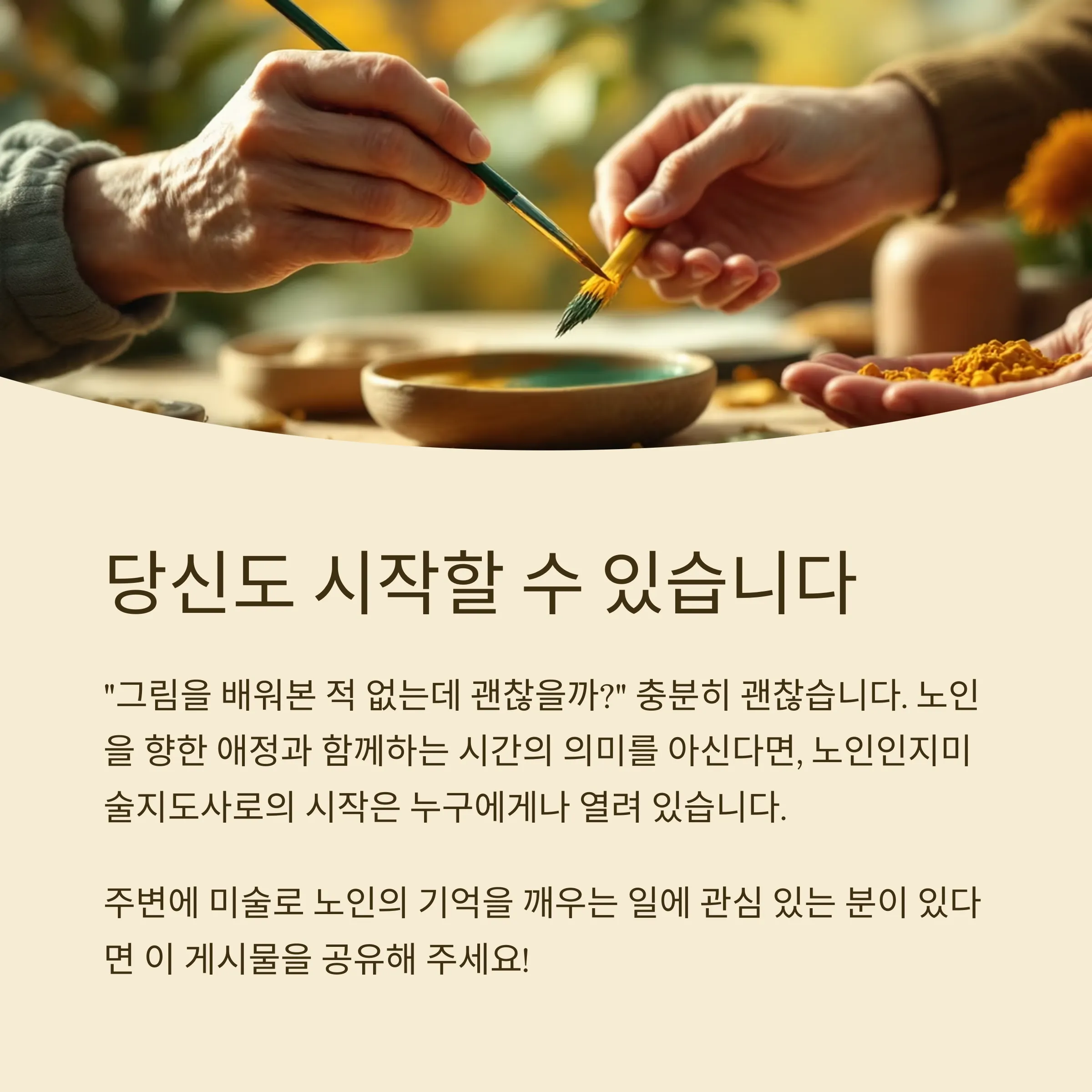 미술을 좋아하면서 동시에 따뜻한 공감 능력을 가진 분이라면 적격입니다. 꼭 미술 전공자가 아니어도 무방하며, 중요한 건 어르신을 이해하려는 마음, 그리고 인내심입니다.