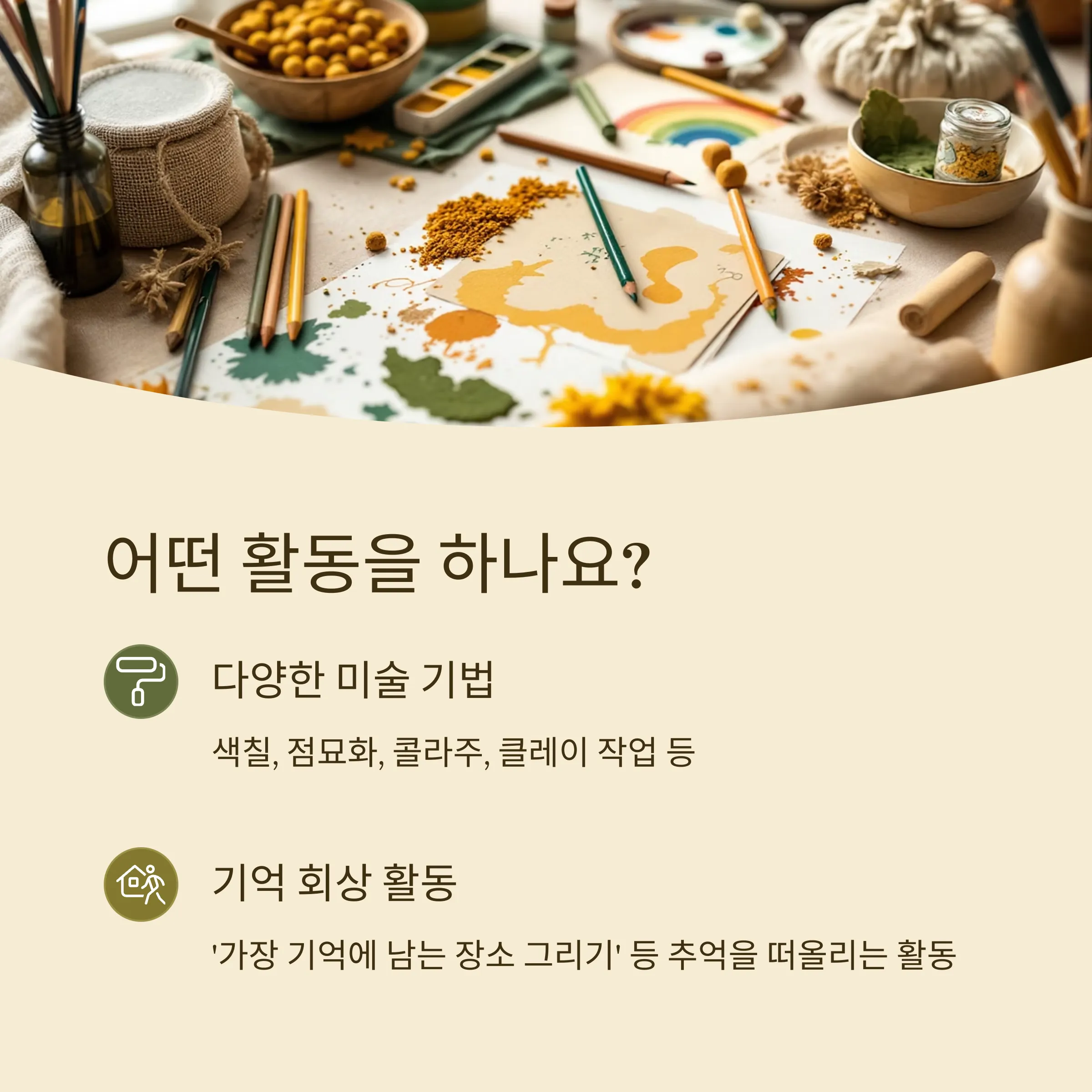 "내가 이런 그림도 그릴 줄 알았나 싶어, 신기하고 재밌어요." 이처럼 어르신들은 자신을 표현하고, 타인과 비교하지 않는 자유로운 미술을 통해 자존감과 활력을 되찾는 경우가 많습니다.