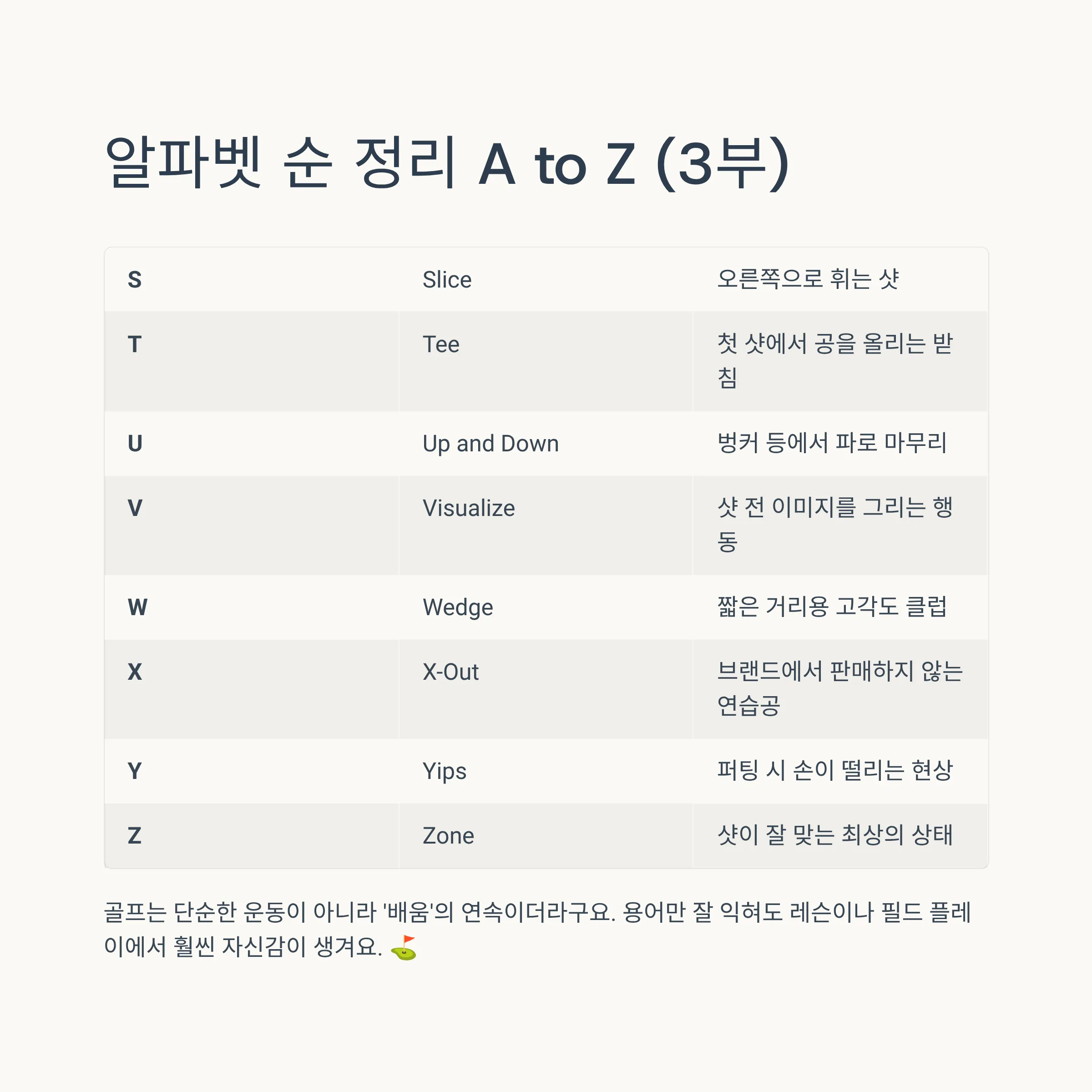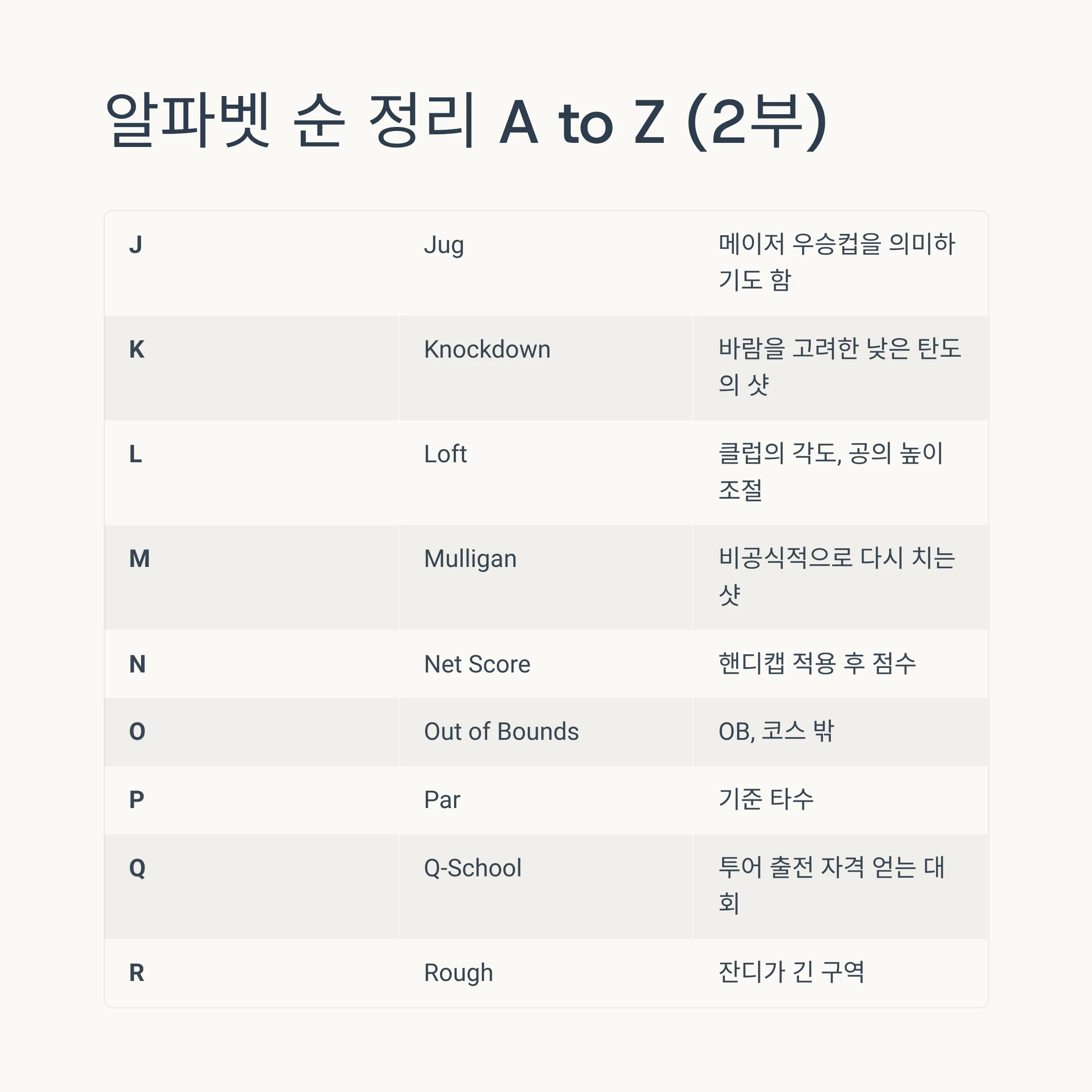 모든 스포츠엔 전문 용어가 있지만, 골프는 특히 생소한 외래어가 많아서 초보자 입장에선 부담스럽게 느껴질 수 있답니다. 하지만 너무 걱정하지 마세요. 용어 하나하나가 골프의 재미를 더해주는 요소이기 때문에, 알고 나면 경기가 훨씬 흥미진진해져요!