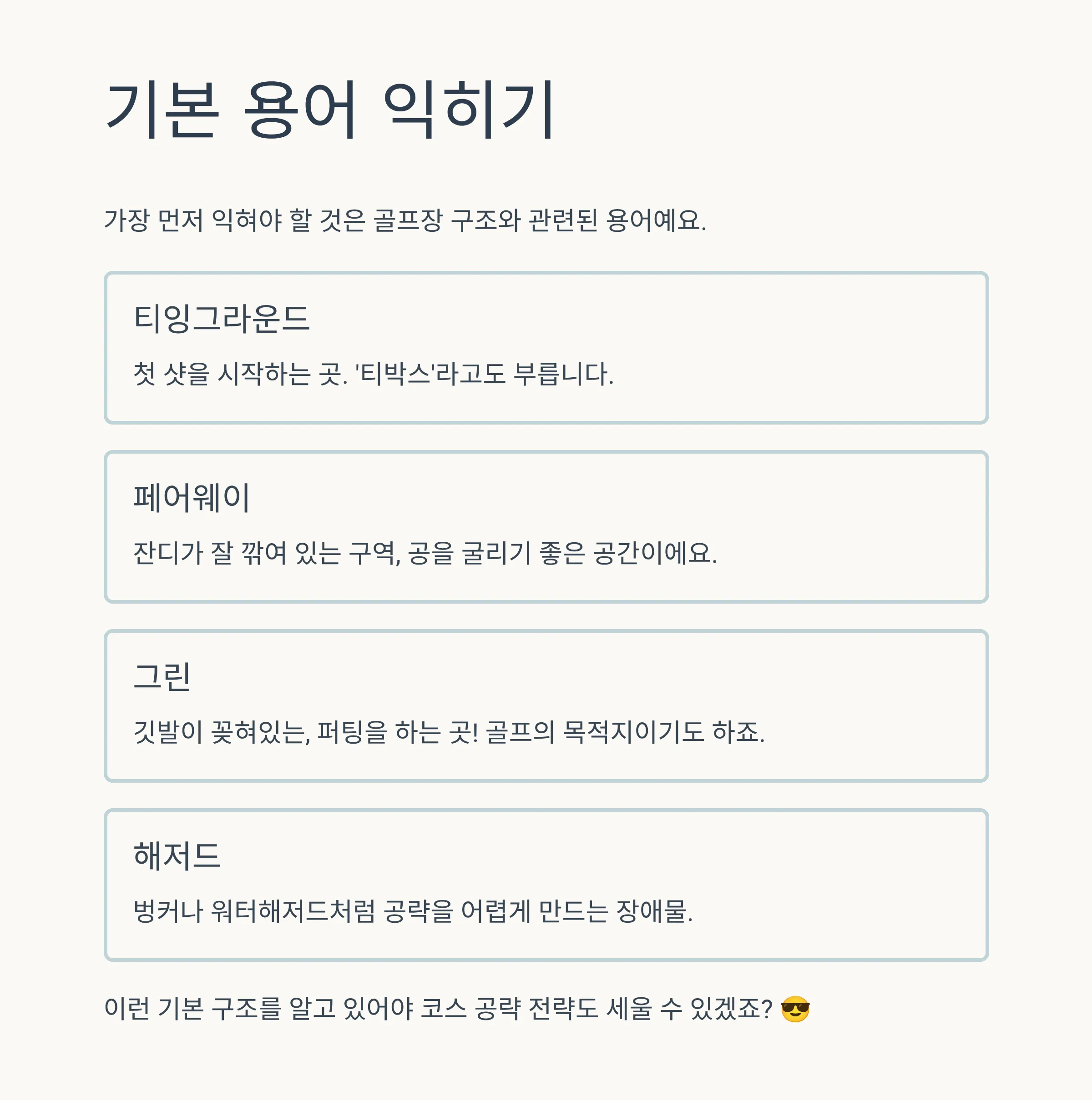 페어웨이 (Fairway)**: 잔디가 잘 깎여 있는 구역, 공을 굴리기 좋은 공간이에요.