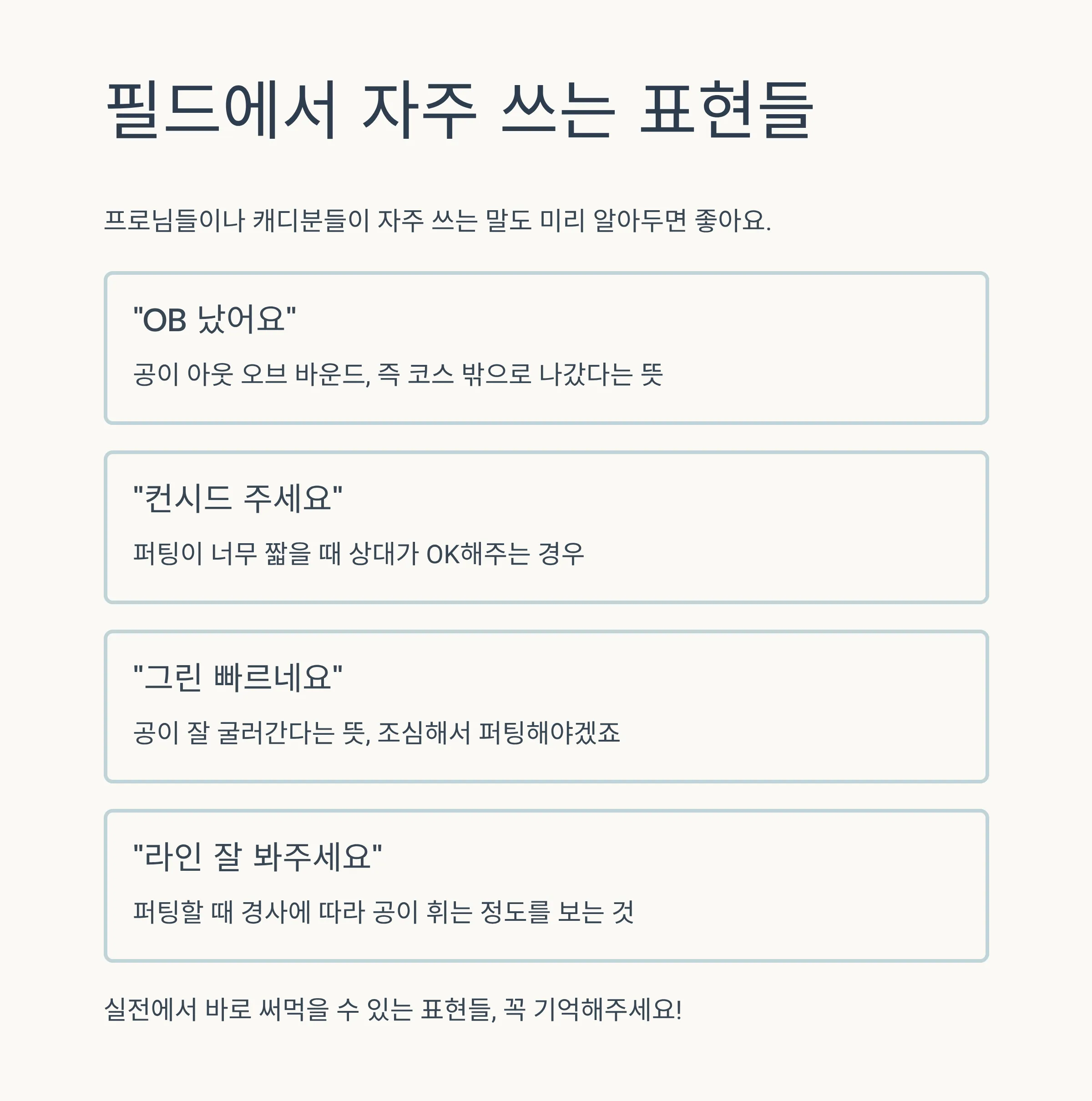 - 그린 빠르네요"**: 공이 잘 굴러간다는 뜻, 조심해서 퍼팅해야겠죠