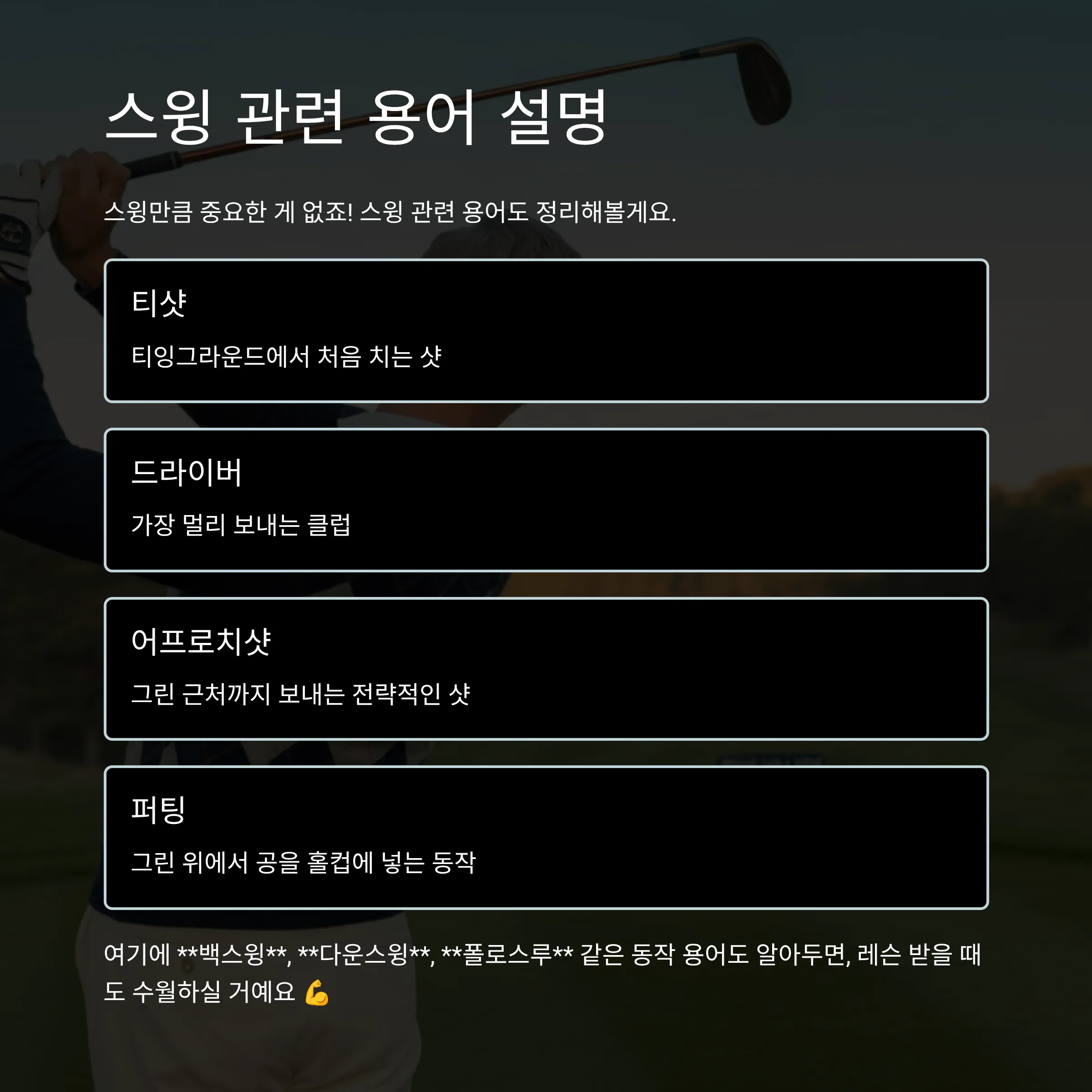 스윙만큼 중요한 게 없죠! 스윙 관련 용어도 정리해볼게요.